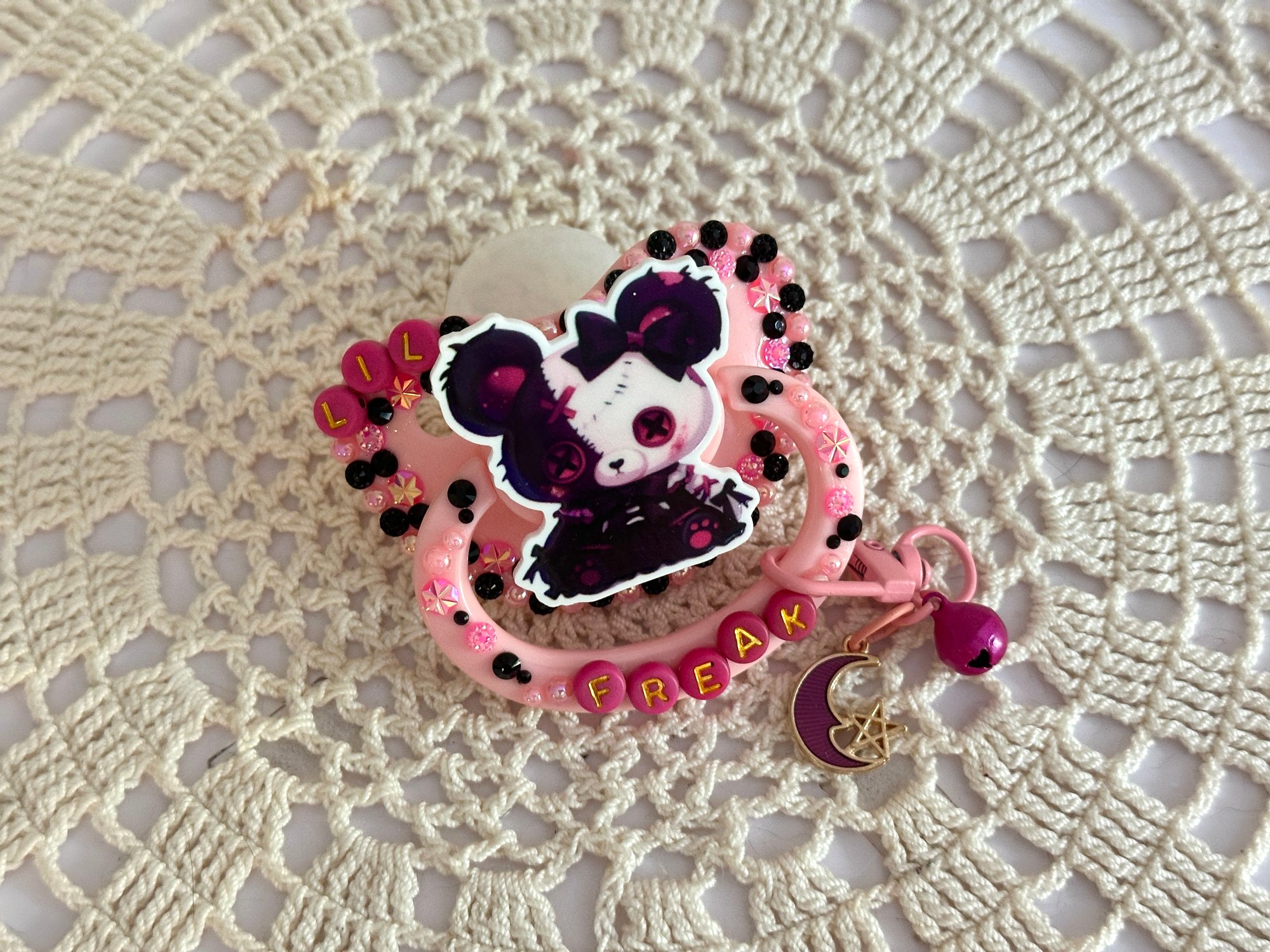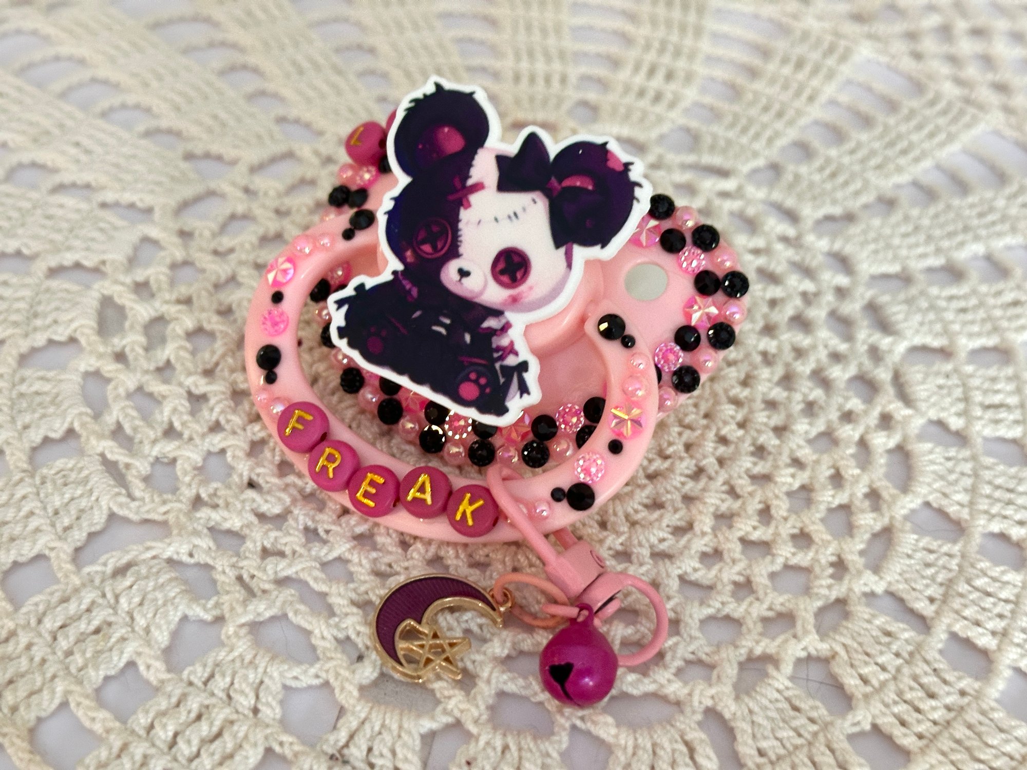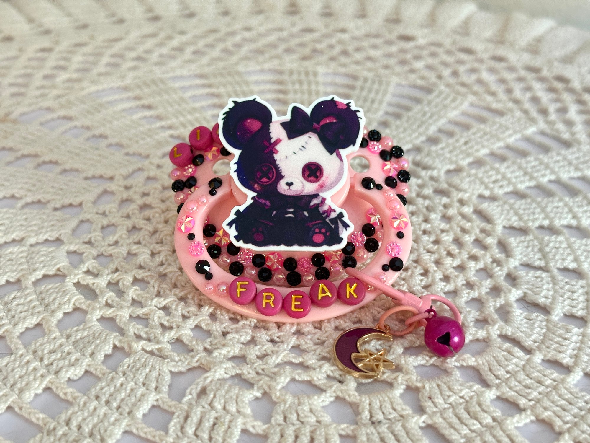 Hand decorated black and pink adult pacifier with spooky teddy theme.